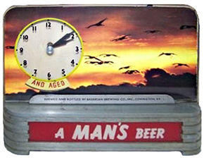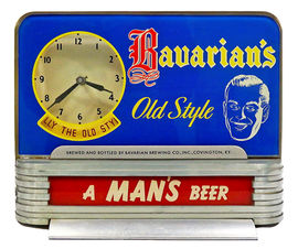 Bavarian's Old Style c. Late 1940s Early 1950s. These displays were electronic and called cash register clocks, because they would usually sit atop a register. Those below date between the late 1940s and early 1950s. They have logos that spin around the bottom of the clock and the bottom and top were lit. The main background was typically what is shown in the lower left. But as depicted on the right below, the background could be changed.