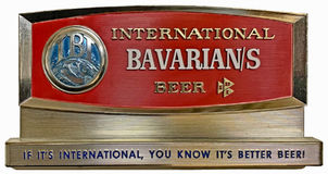Other Shelf Signs c. 1960 - 1965. The Bavarian's Select Beer sign below could be hung, but it also had a stand and was as a shelf sign. The plastic rim resembled the cross section of a barrel and the item has back lighting that illuminates the entire center. The next sign for International Bavarian/s Beer was plastic and unlighted. The last sign was a plastic emblem on wood and it fit in a wood stand.