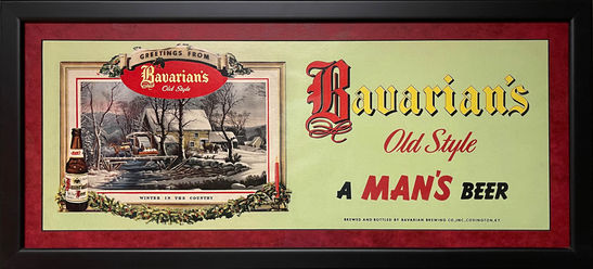 As compared to a rectangular paper posters, a variation were the cardboard "Prop-Up" posters that had a built-in pull-out stand in the back that allowed them to easily rest on a bar, shelf or flat surface. They could also have an irregular shape and a hook for hanging. A common theme with many of these items is that they often depicted men to associate with Bavarian's "A Man's Beer" slogan. They also could use old-time scenes or subject matter to correspond with the "old" style of Bavarian's Old Style Beer.