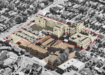 These aerial photos were taken in the mid 1950s, but have been annotated to reflect the property that comprised the brewery when it was incorporated by the Schott Brothers in 1938. The brewery site is shaded in yellow. The photo on the left has buildings identified according to letters and numbers identified in previous periods. Those buildings not shaded had been sold and owned by others.