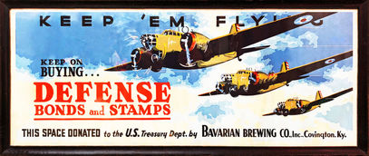 1942-5. The images below were likely trolley posters that were placed inside street cars shortly before and during WWII. They were paid for by businesses, like Bavarian Brewing Co., and encouraged the purchase of bonds to help fund WWII. Before 1942, these bonds were known as “Defense Bonds,” as shown in the illustration on the left below. However, the name was changed to “War Bonds” after the U.S. entered WWII, as shown by the poster on the right. Over 80 million Americans purchased these bonds out of a U.S. population at that time of about 135 million.